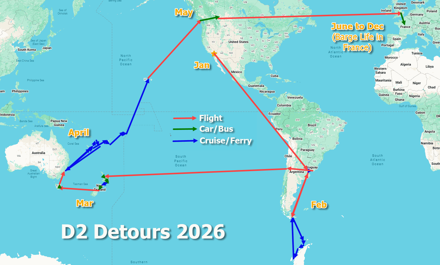 As of the start of 2026, we’re in Southern California, where we celebrated Christmas with family. At the end of January, we head to Argentina for almost a month, which includes a cruise to Antarctica, where we’ll be able to walk on the remote continent. After that, we’re off to our final continent: Oceana, with stops across New Zealand, Australia, and a few island nations, before continuing to Canada for family events, then to England in June to be certified as a captain, then finally to the barge we’ve purchased in France, where we’ll spend the rest of the year.