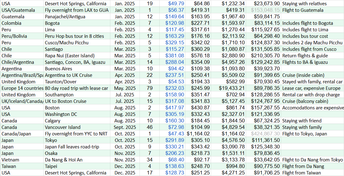 Nomadic Avg/day – These are ALL of our costs while living our nomadic lifestyle, which includes the Location Avg/day expenses above, plus flights or other transportation to get to that location, health expenses and insurance, data packages, subscriptions (Netflix and other streaming services, web site hosting, Adobe Lightroom, VPN, misc apps, etc.). So far we have averaged out to $163.37/day, so feel pretty good about staying within our budget.